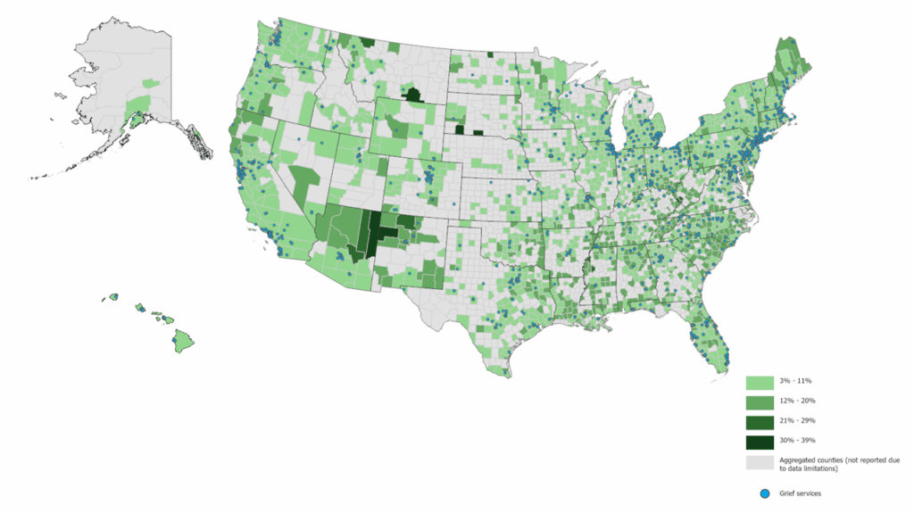This map shows the projected percentage of children in each U.S. county who are expected to lose a parent or sibling before age 18. Each dot marks a location offering grief support. Where the map shows no dots, communities may lack access to these critical resources. Tap or click the map below to zoom in for more detail.